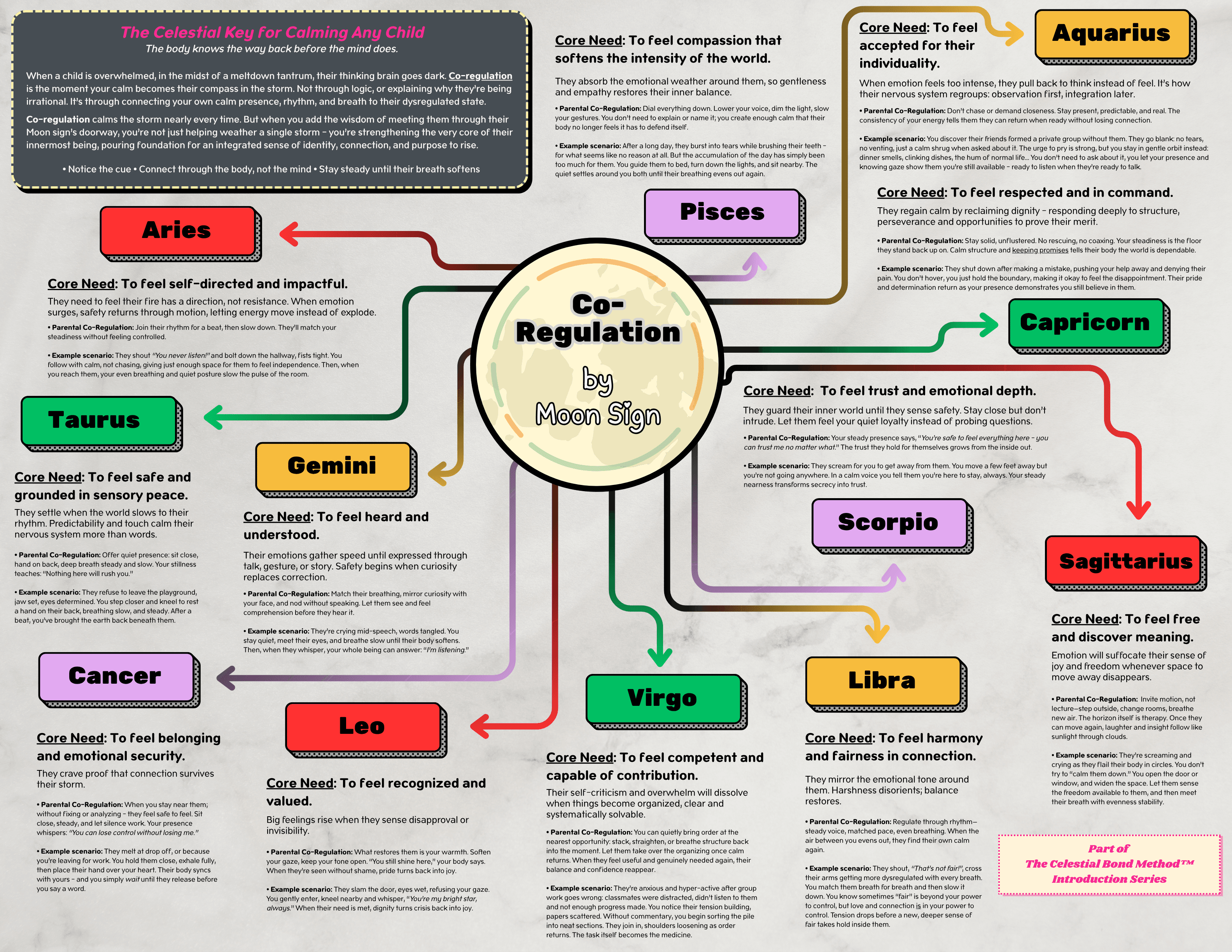 Inside, you’ll discover how evidence-based methods like Co-Regulation, Growth Mindset, and Scaffolding transform into super-powers when tailored to your child’s unique astrological wiring. Why certain approaches instantly soothe your child while others (even the “right” ones) fall flat.